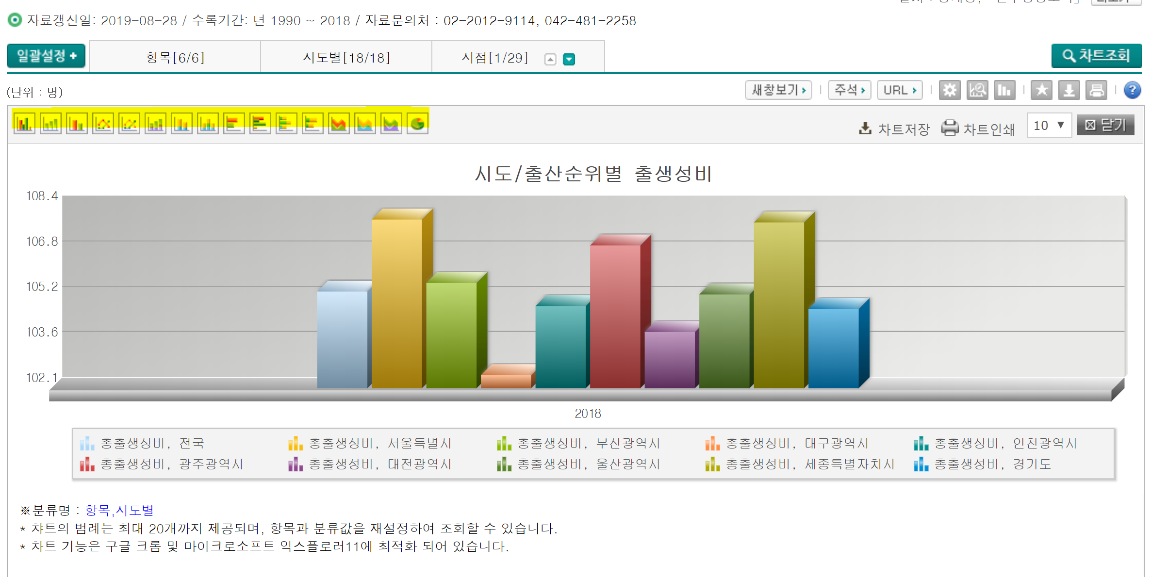 KOSIS에서는 다양한 차트를 제공하며, 필요에 따라 차트를 만들어 다운로드할 수 있습니다.
