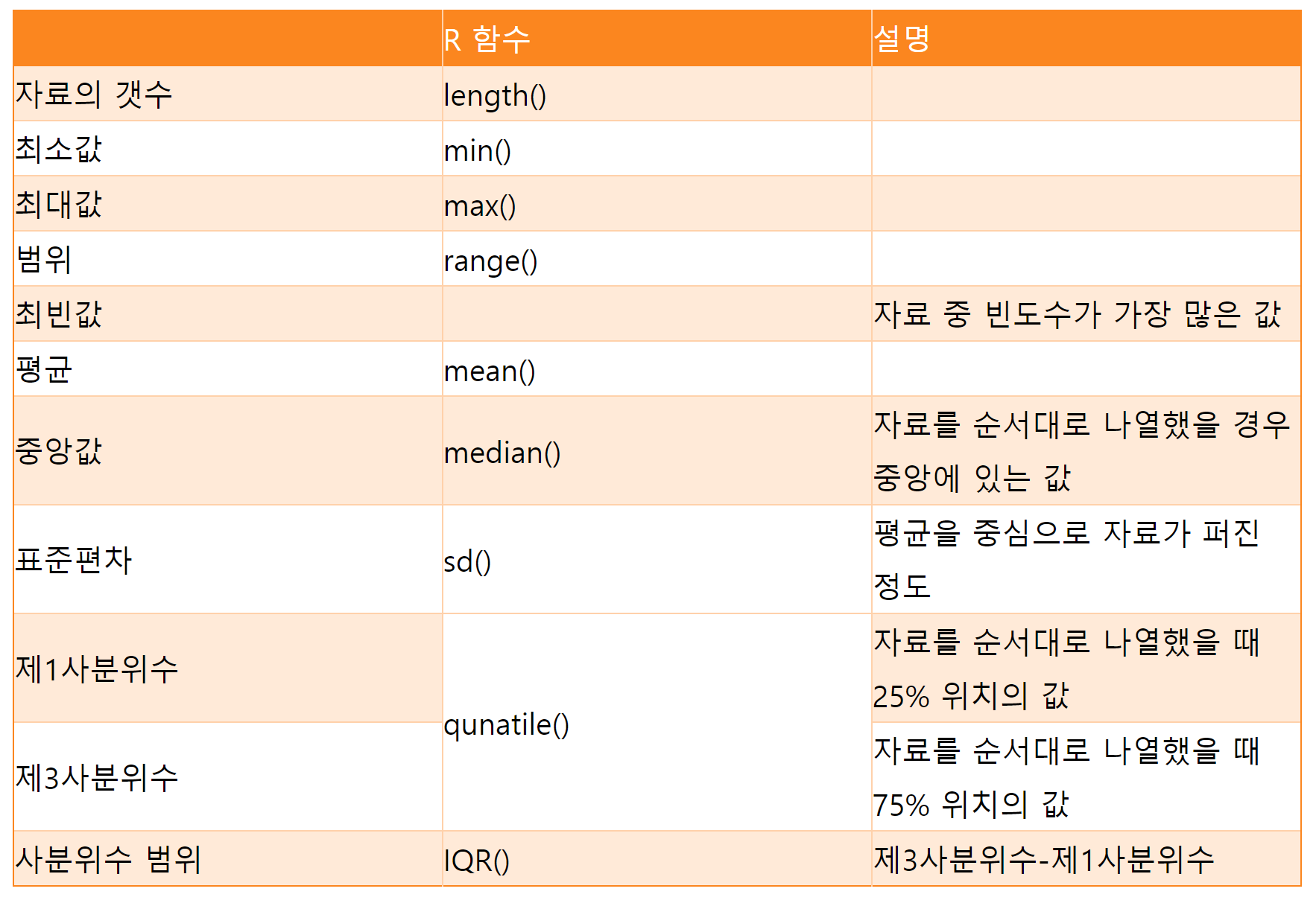 개요 이번 포스팅에는 R에서 사용하는 기초통계 관련 함수들을 알아본다. 해당강의에서는 기초통계학의 내용은 다루지 않고 기초통계학에서 사용하는 기법들을 R에서 어떻게 적용하는지 다룬��