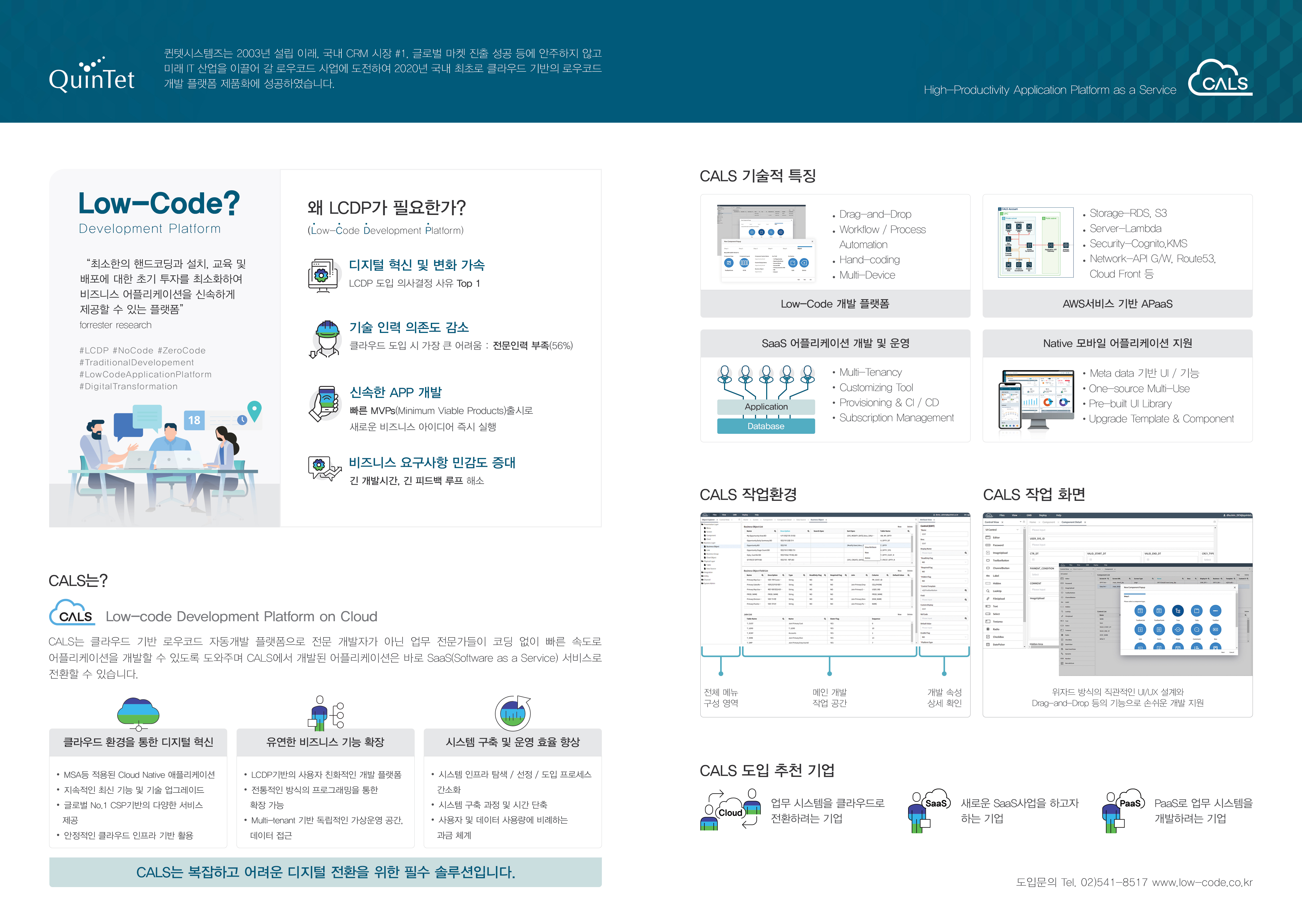더 쉽고 더 빠르게 직접 필요한 솔루션을 클라우드에 만들어보세요 이제 모두가 CALS를 사용하여 클라우드에서 더 쉽고 빠르게 로우코드 엔터프라이즈 어플리케이션을 만들 수 있습니다.