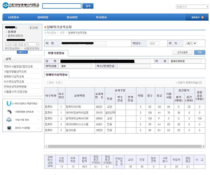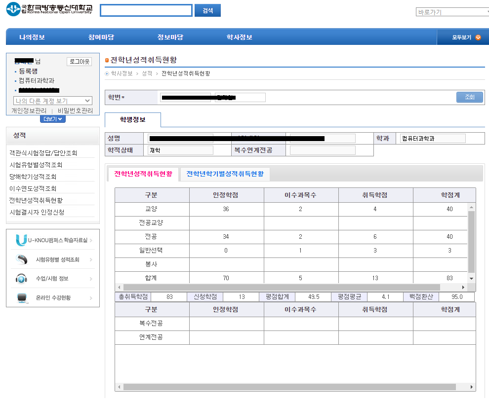 ( 로그인 ▶ 나의 정보 ▶ 전학년성적취득현황 ▶ 조회 클릭 )