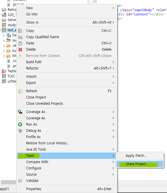 해당 프로젝트를 오른쪽 클릭하여 TEAM ▶ Share Project