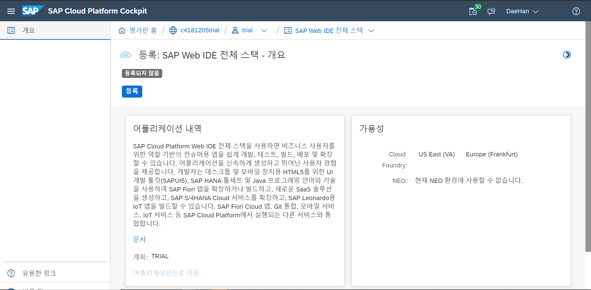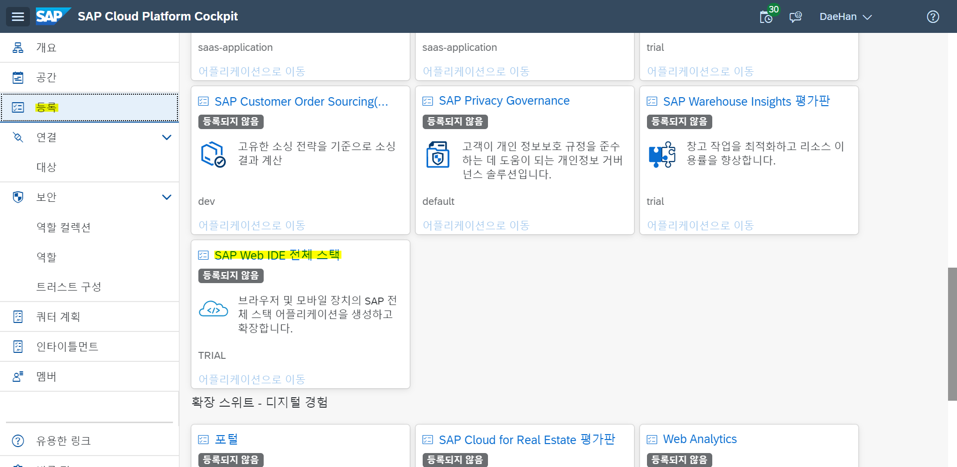 등록 ▶ SAP Web IDE Full-Stack ( SAP Web IDE 전체스택 ) 을 클릭