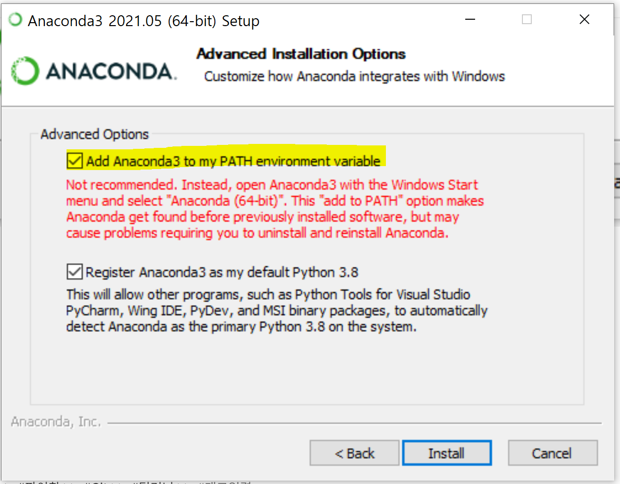 설치과정에서 위 <Add Anacona3 to my PATH environment variable>을 반드시 체크합니다.