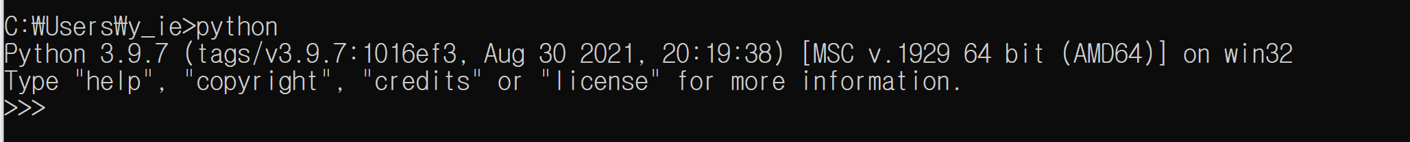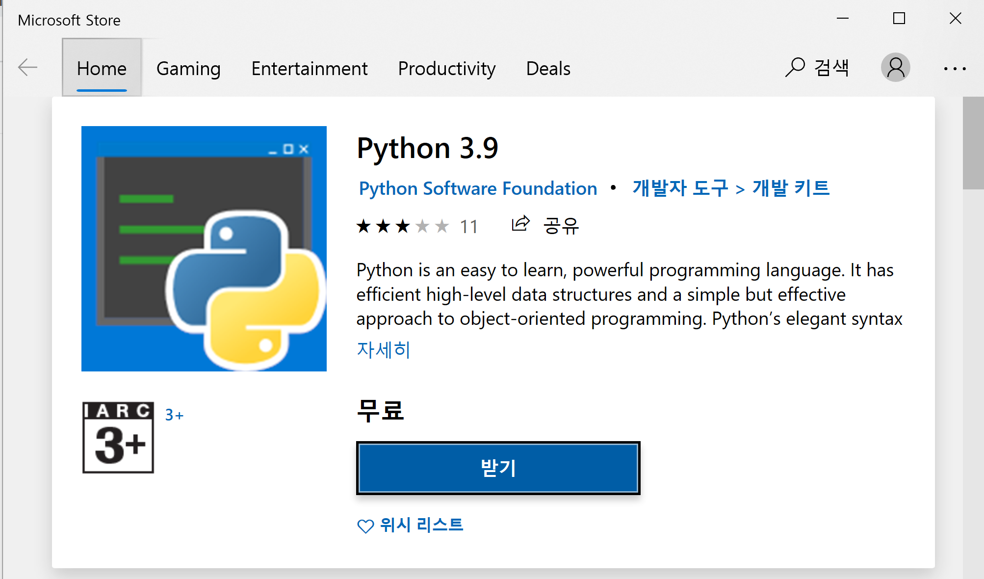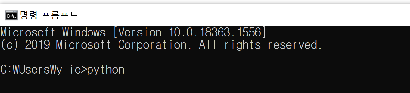 윈도우키 > CMD를 검색하면 명령 프롬프트가 호출됩니다. 호출된 명령 프롬프트에 python을 검색하면 위와 같이 Python 설치 문구가 호출됩니다.