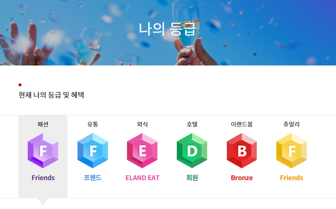 이멤버의 등급은 크게 패션, 유통, 외식, 호텔, 이랜드몰, 주얼리로 나누어집니다.
