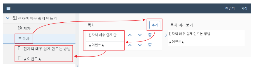 책 만들기 화면에서 [목차]를 클릭합니다. 우측에 보이는 [추가]를 클릭합니다. 원하는 목차를 설정하고 Enter 입력.