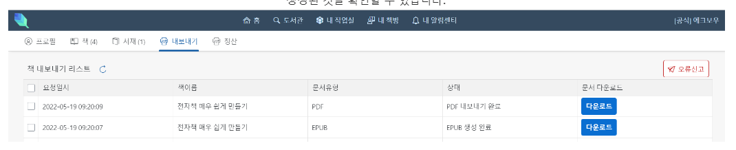 위 그림과 같이 내보내기 매뉴를 클릭하면 PDF와 EPUB이 정상적으로 생성된 것을 확인할 수 있습니다.