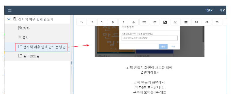 [책] 메뉴를 클릭한 후에책만들기 버튼을 클릭합니다.그 다음 책 이름을 넣고 [생성] 버튼 클릭하면 책이 만들어 집니다.