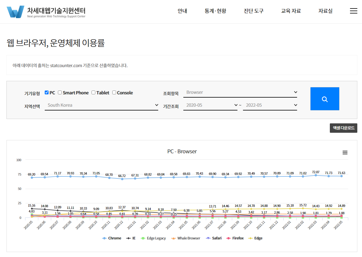 차세대 웹 기술 지원센터의 통계자료를 보면 엣지의 점유율은 매우 낮습니다. 대부분은 Chrome 환경을 사용합니다.