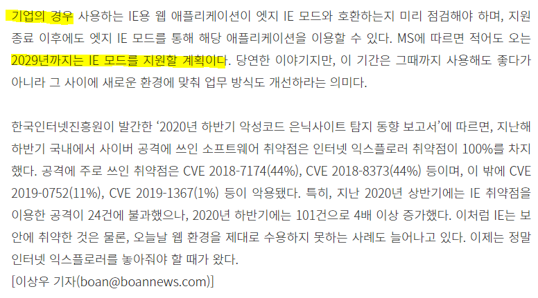 보안뉴스 이상우 기자의 기사를 보면, 엣지 IE모드는 2029년도까지 지원 예정인 것을 알 수 있습니다.