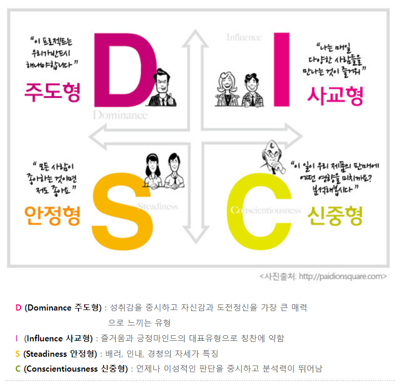 DISC 는 성격유형의 검사중 하나이며, 성격을 아래와 같이 구분합니다.