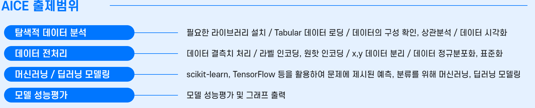 1개의 Tabular data 데이터가 주어지며 파이썬 코딩으로 주피터 환경에서 분석 처리 AI 모델링 14개 문항으로 구성됨.