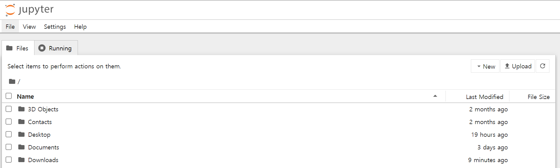 cmd 창에서 jupyter notebook를 입력하여 주피터 노트북 실행