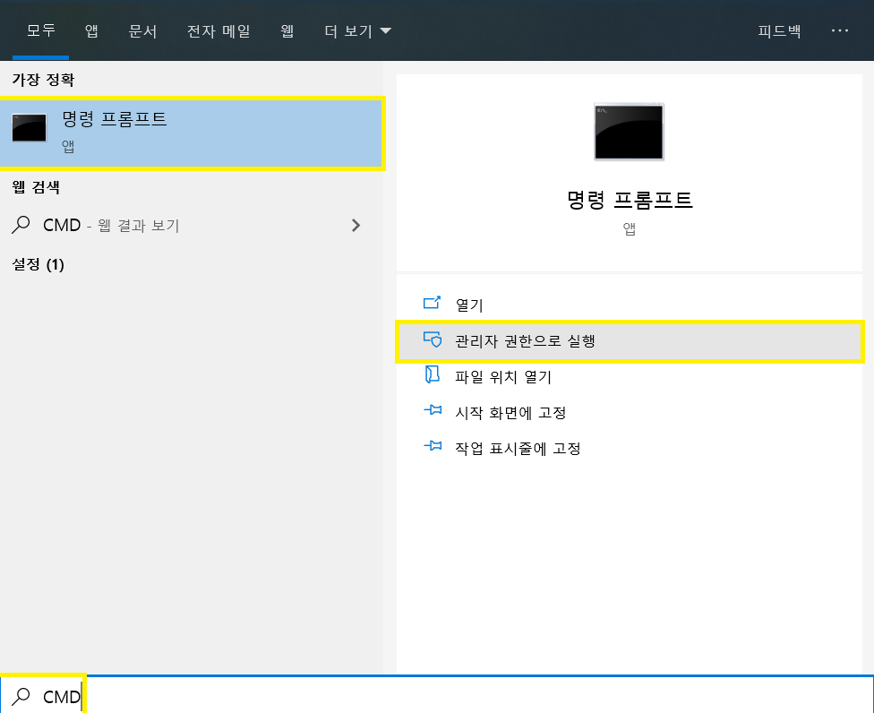 2.명령 프롬프트 관리자 권한으로 실행합니다.