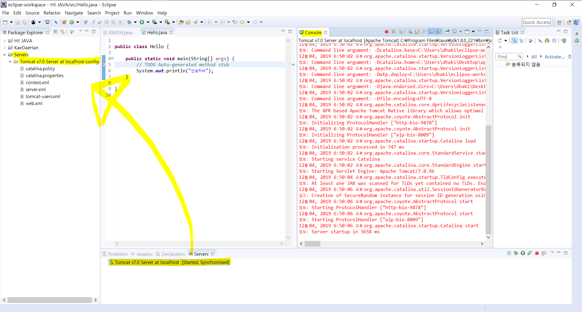 톰캣을 등록후 Servers Tab을 우측클릭하여 Start를 선택합니다. ( 웹서버는 좌측 Package Explorer에 저장된 Servers 설정을 읽어옵니다. ) 정상적으로 실행되면 Console에 톰캣을 실행했던 화면과 동일한 로그가 출력됩니다.