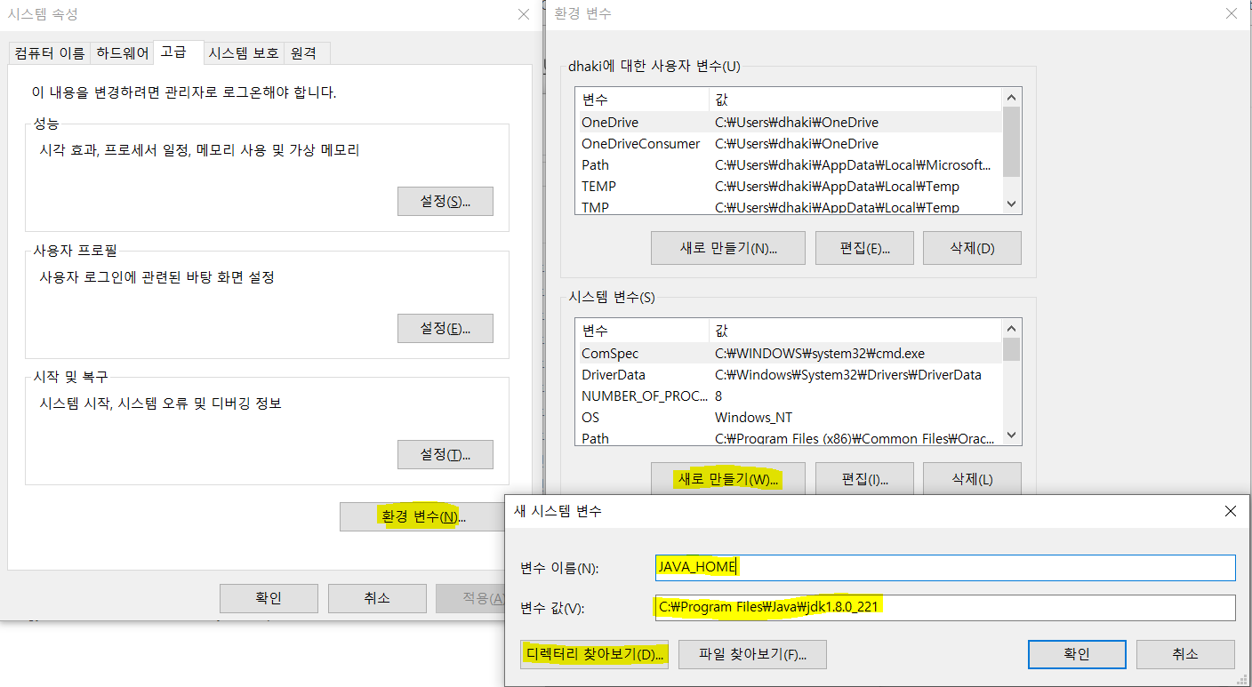 윈도우 검색 > 고급 시스템 설정 보기 > 환경 변수 > 시스템 변수 : 새로 만들기 > JAVA_HOME 생성합니다.