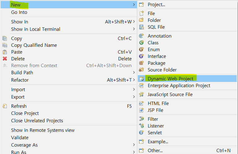 테스트를 위해 웹 프로젝트를 생성합니다. ( New > Dynamic Web Project )