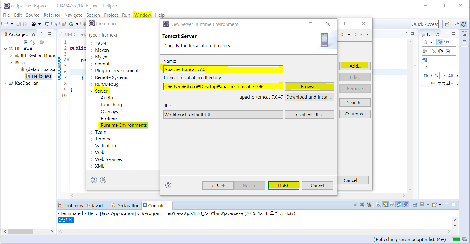 Window > preferences > Server > Runtime Enviromments > Add를 선택하여 설치한 Tomcat를 추가합니다.