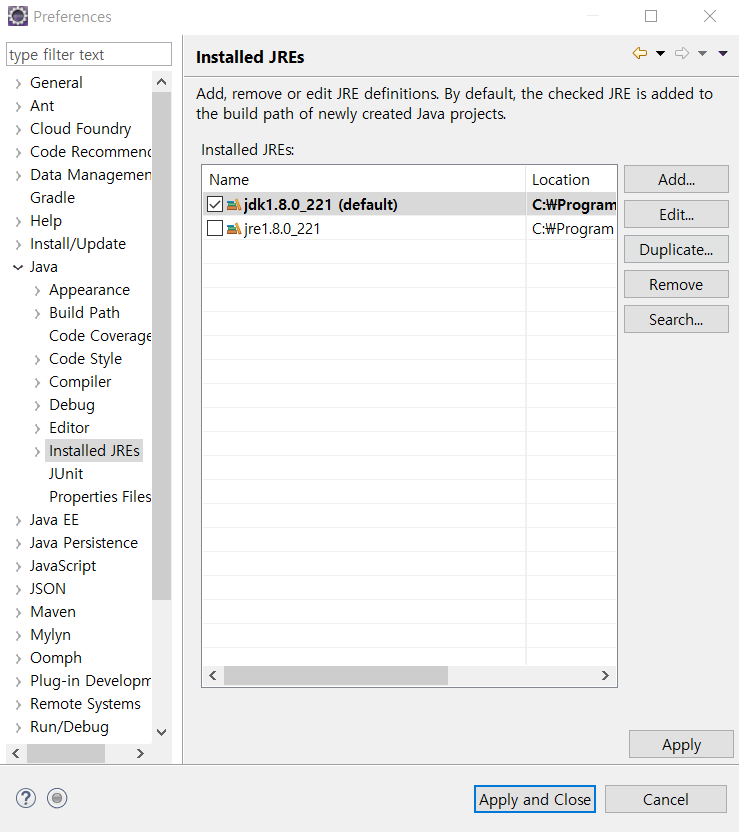 Eclipse설치 후 Window > preferences > Java 에서 1번에 설치한 jdk위치를 Intsall하여 default 합니다.