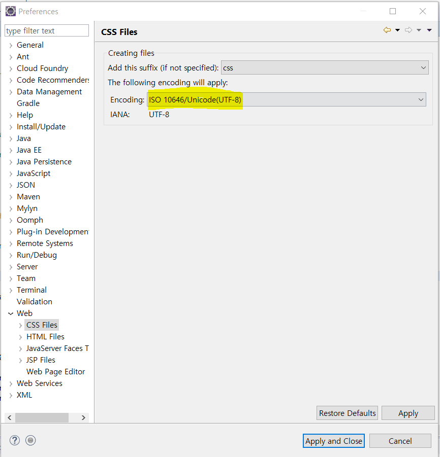 Web - CSS Files encoding와 Web - HTML Files encoding를 ISO 10646/Unicode(UTF-8)로 설정합니다.