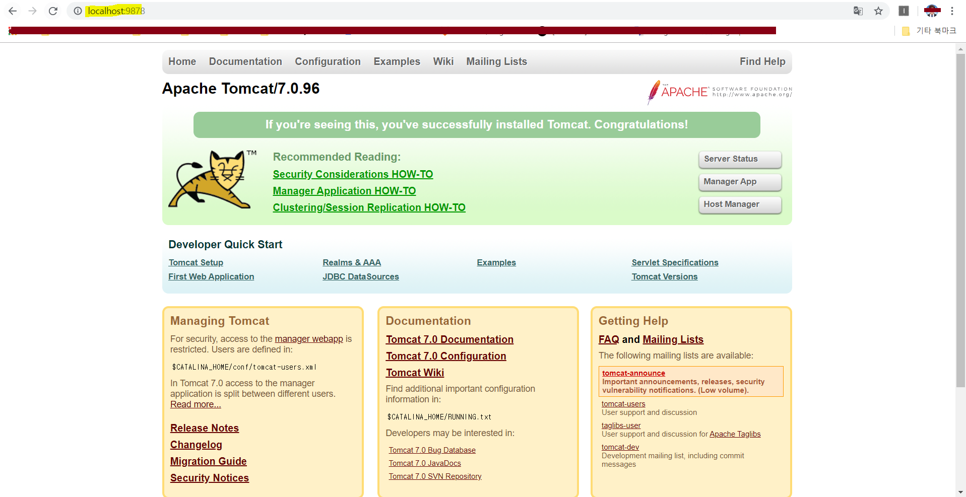 Tomcat의 실행을 확인하면 localhost:8080(포트번호)를 웹브라우저에 입력하여 위 화면이 호출되는지 확인합니다.