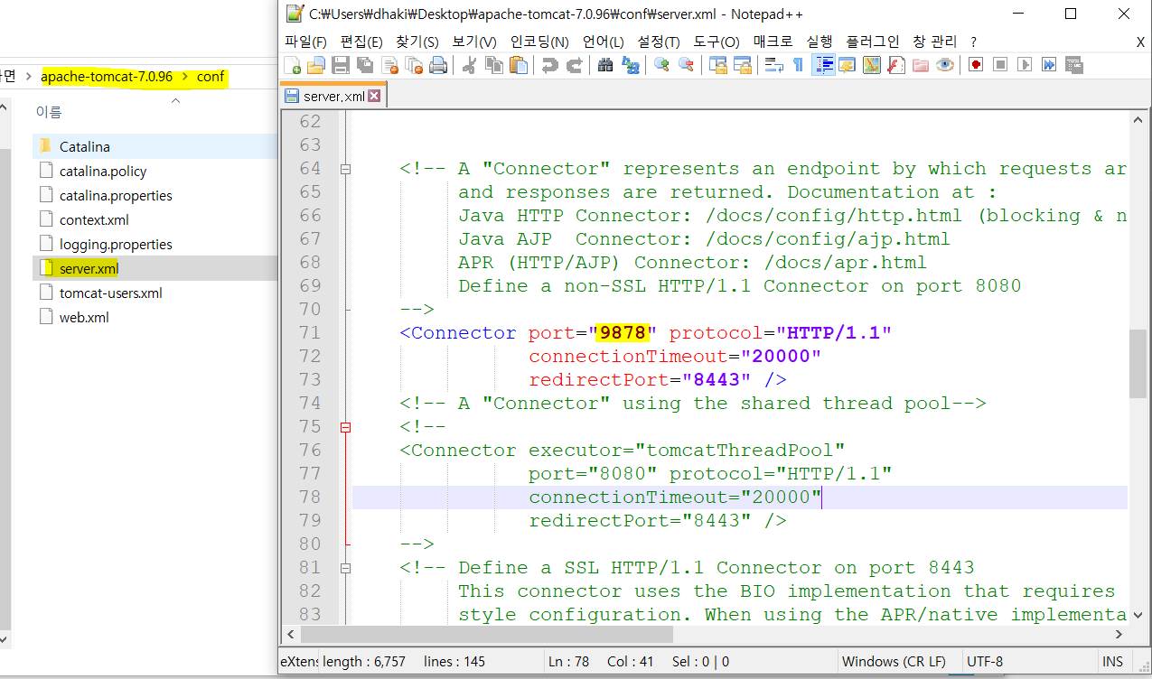 cont > server 파일을 메모장으로 연후 port="8080" 값을 임의의 값으로 변경합니다.
