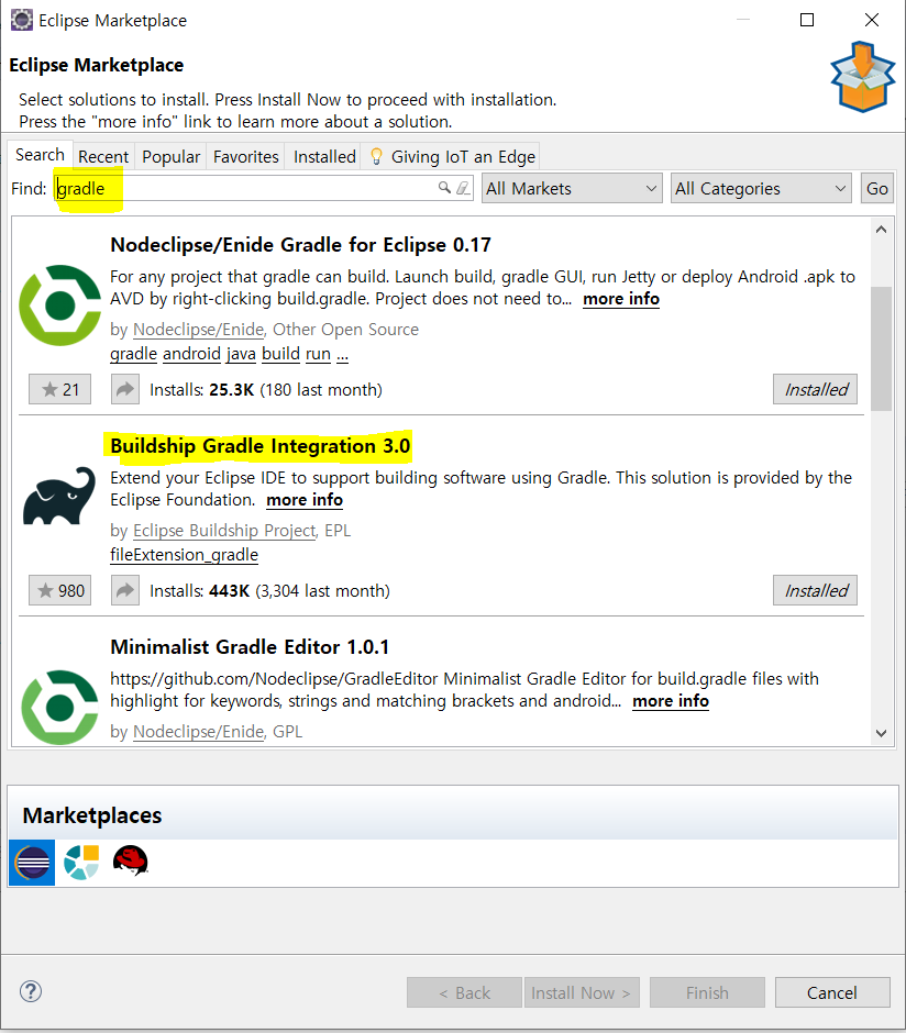 Help > Eclipse Marketplace > gradle를 검색 합니다.