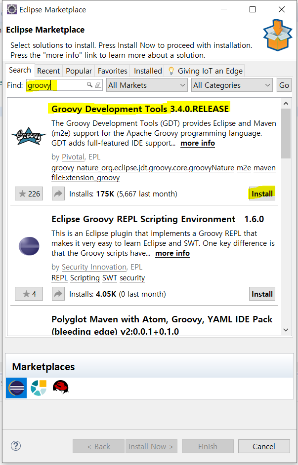 Help > Eclipse Marketplace > groovy 검색 합니다.