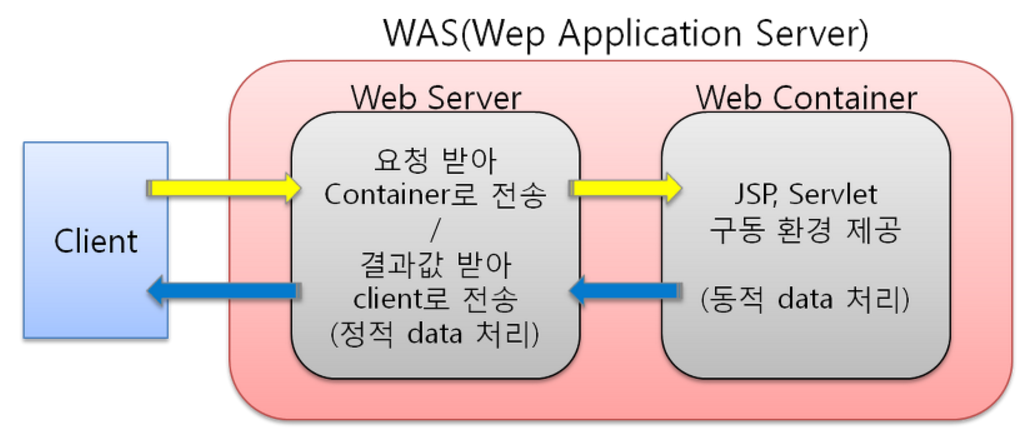 웹 애플리케이션 서버 (Web Application Serve) : 웹 애플리케이션과 서버 환경을 만들어 동작시키는 기능을 제공하는 소프트웨어 프레임워크