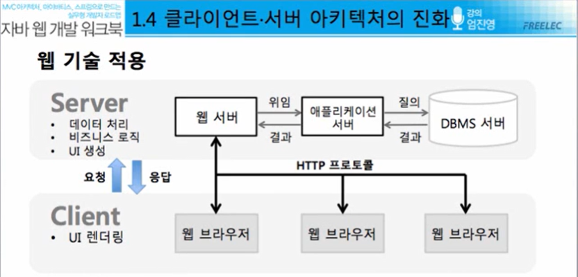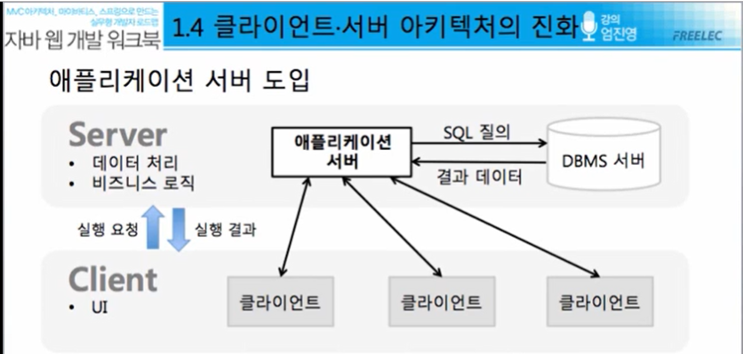 클라이언트 ( 프레젠테이션 ) - 애플리케이션서버 - 서버 ( 비즈니스 로직, 데이터로직 )으로 발전했습니다.