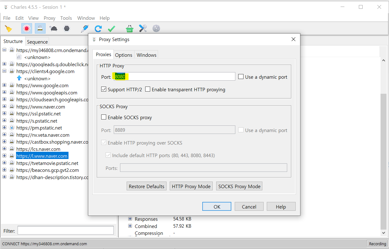 Windows Proxy가 체크되었으면 웹페이지를 이동시마다 HTTP 프로토콜이 모니터링될 것입니다.