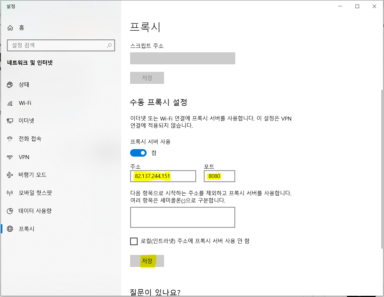 변경할 Proxy IP / Proxy Port 를 기억해둡니다.