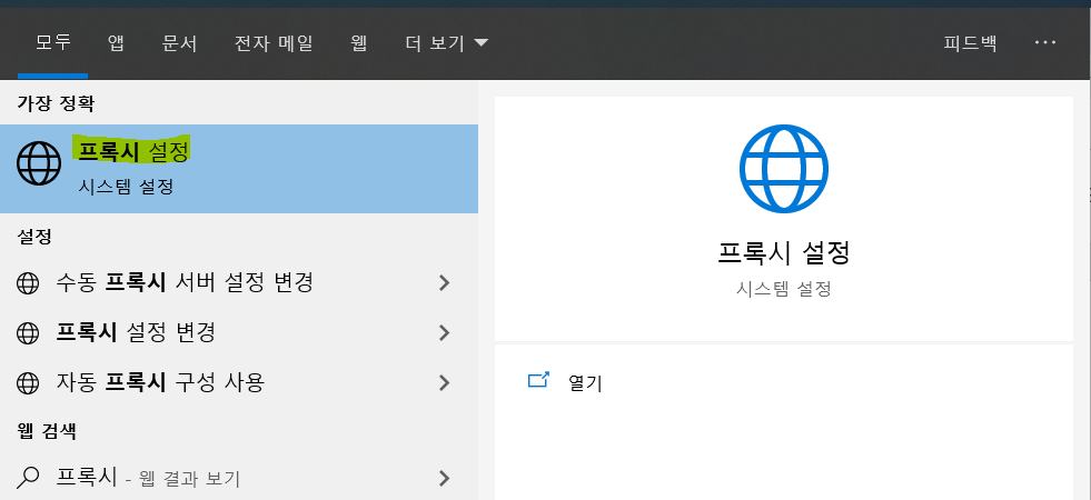시작메뉴에서 프록시 설정을 검색하여 선택합니다.