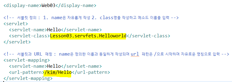 [ servlet-class ]는 클래스명 + 메소드명으로 작성되며 [ url-pattern ]은 호출할 url 명입니다.