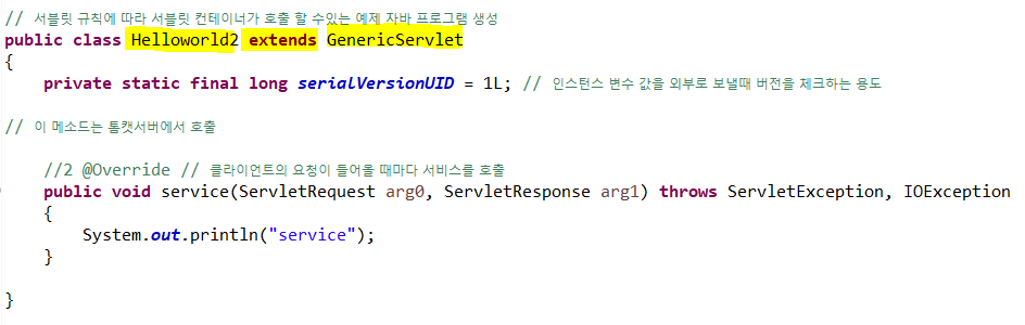 extends GenericServlet를 선언 후 Service를 제외한 메서드를 삭제하고 코드 정리를 합니다.