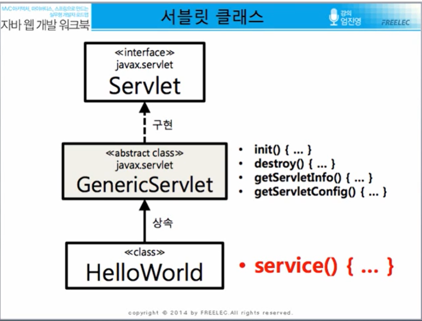 GenericServlet는 추상 클래스로서 service() 외에 공통적으로 사용되는 4EA의 메서드를 상속시키는 역할을 합니다.