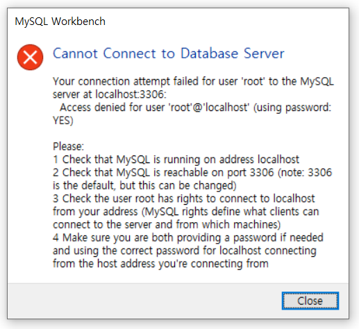 위 방법으로도 해결이 안될 경우 로컬호스트 번호를 변경하여 MySQL 서버를 재설치