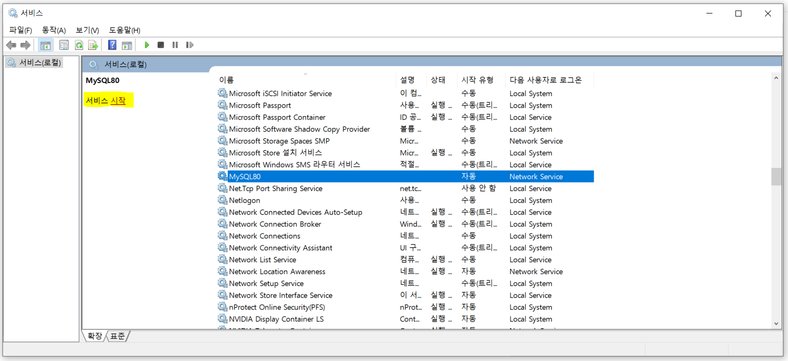 5. 다시 서비스로 돌아가서 중지시킨 MySQL을 재시작합니다. ( 시작이 안 될 경우 PC 재부팅 )