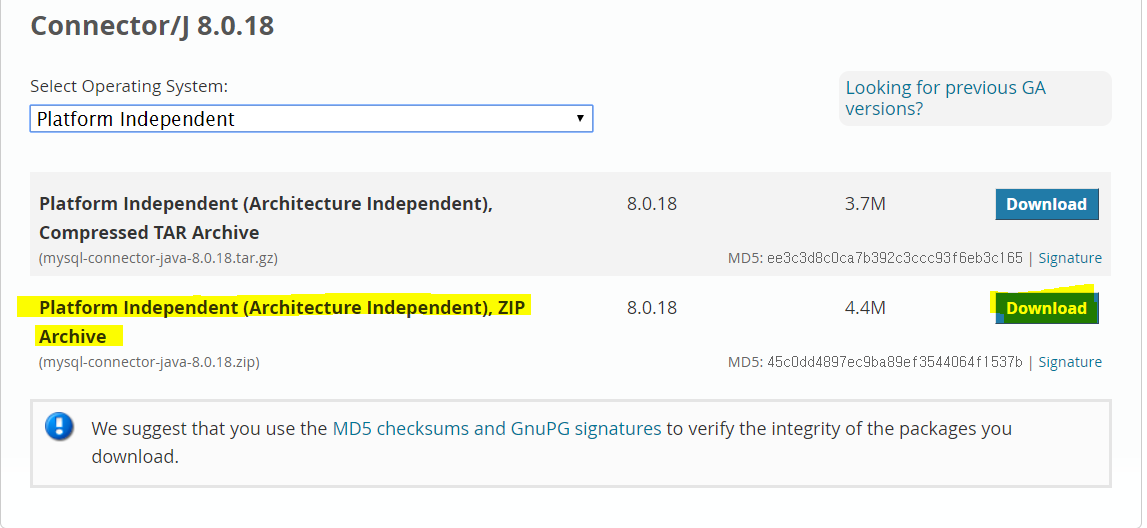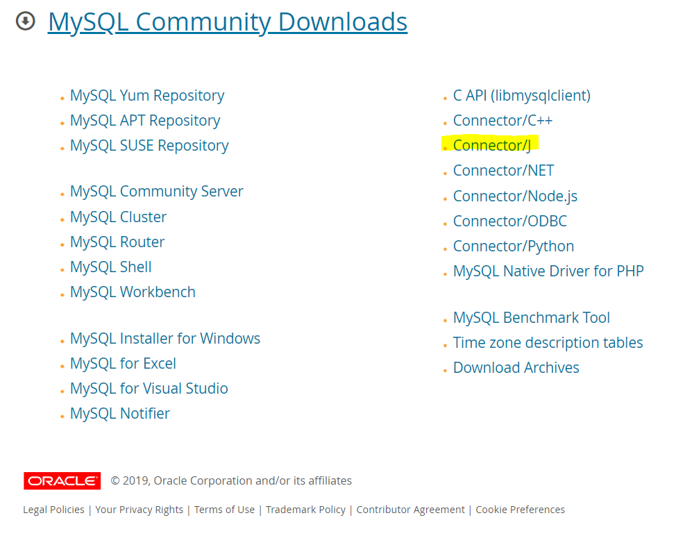 MySQL 다운로드 페이지에서 Connector/J를 클릭합니다.