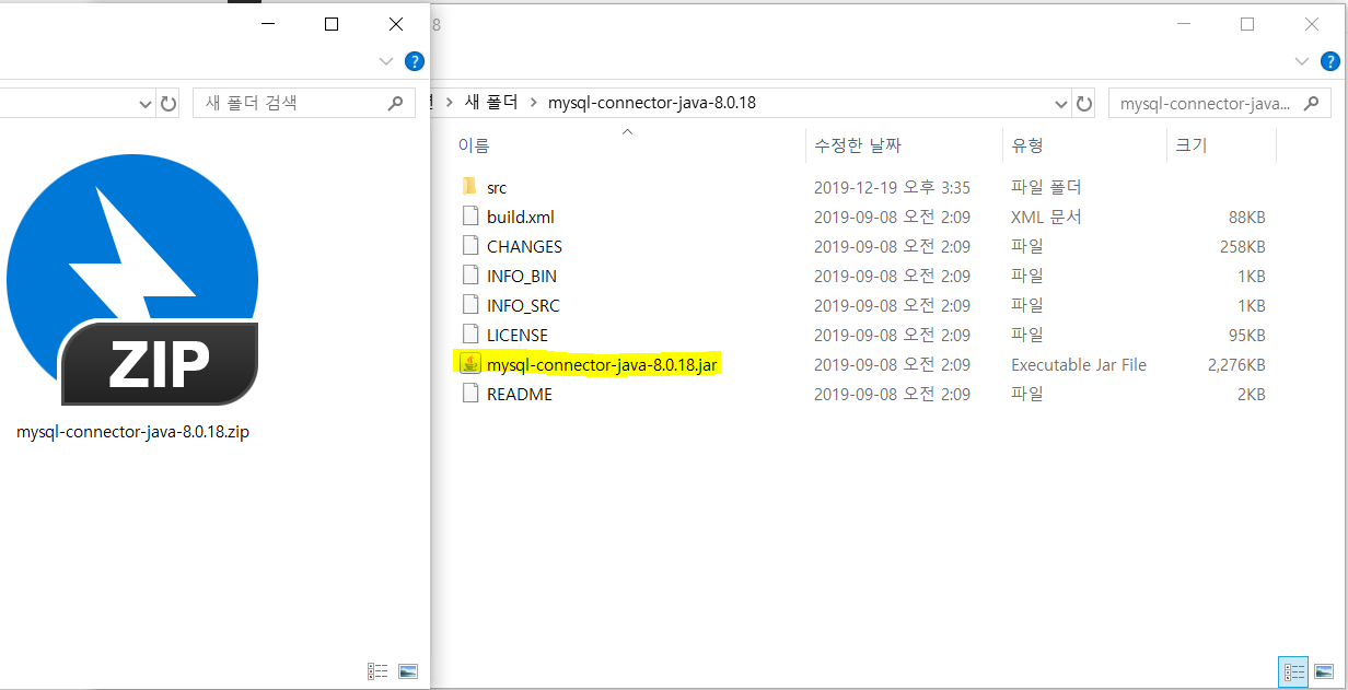 다운로드한 ZIP의 압축을 풉니다. 파일명 : [ mysql-connector-java-8.0.18 ]의 jar파일이 driver로 사용됩니다.