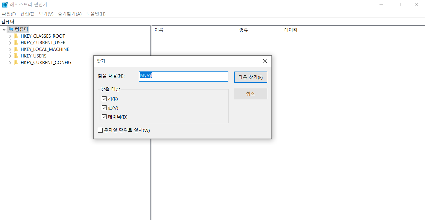 편집 > 찾기 > MySQL > 표시되는 레지스트리 모두삭제