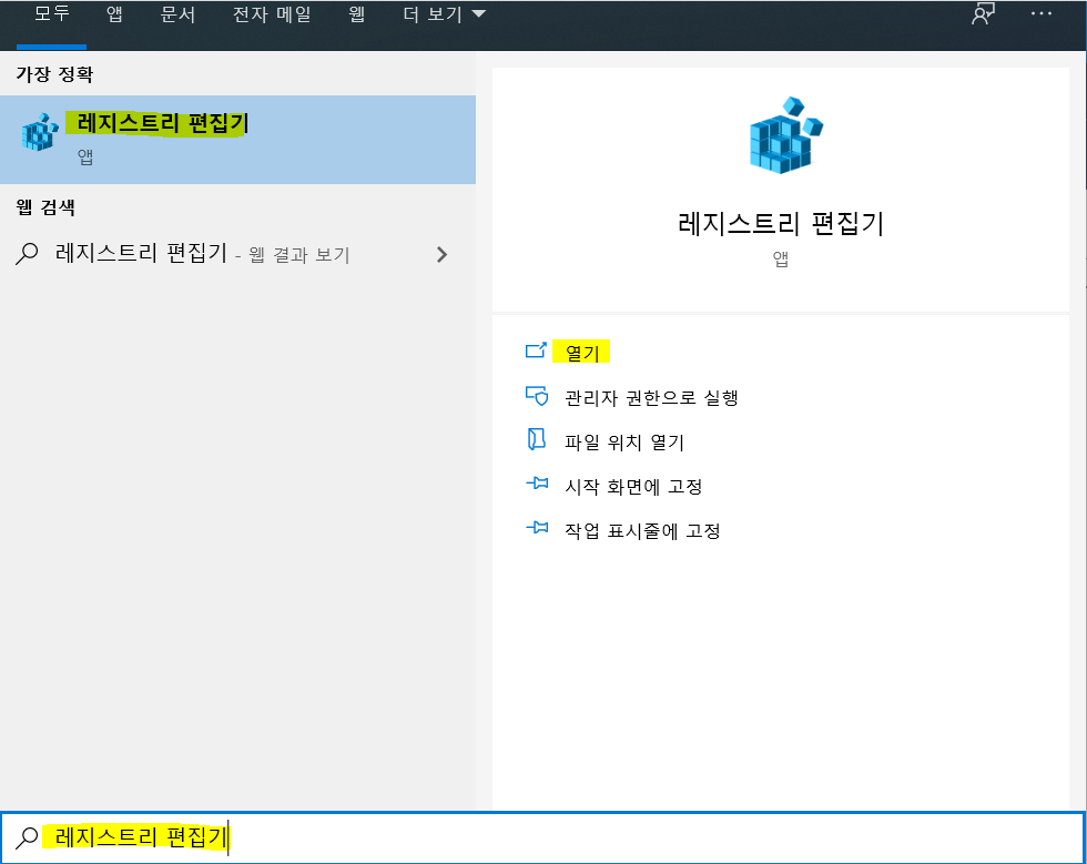 시작메뉴 > 레지스트리 편집기 검색 및 실행
