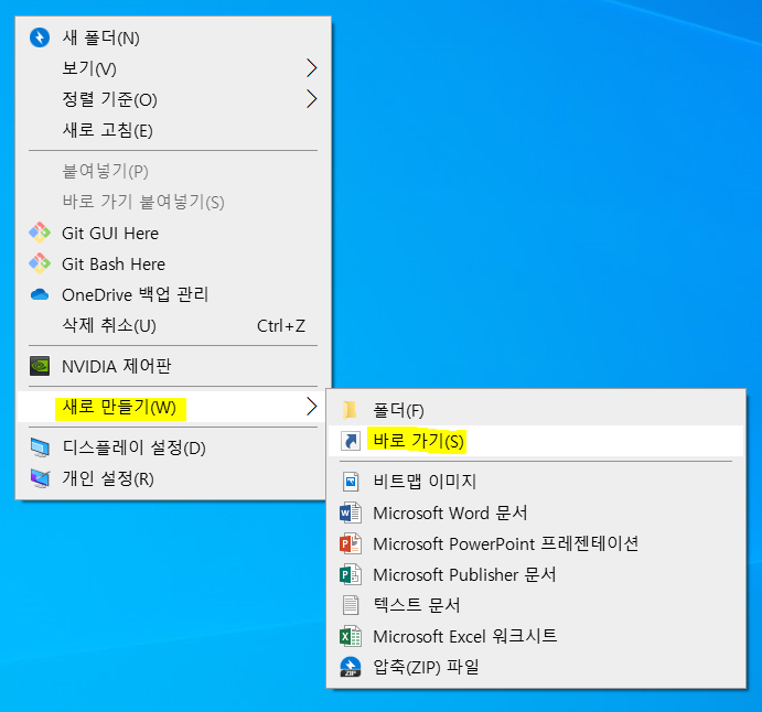 바탕화면 > 마우스 우측 클릭 > 새로 만들기 > 바로가기